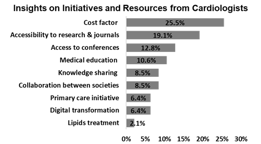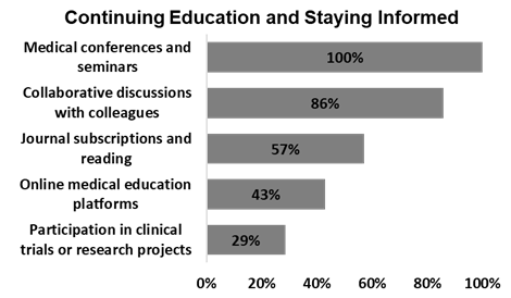 Some cardiologists have also mentioned that to expand their knowledge, they engage in collaborative discussions with colleagues (86%), follow journals and subscriptions (57%), utilize online medical education platforms (43%) and partake in clinical trials or research projects (29%).