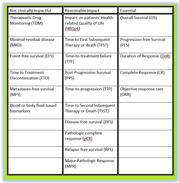 In the case of Minimal Residual Disease (MRD), which has been used as a surrogate endpoint for accelerated approval of acute lymphoblastic leukemia, and Metastasis-free Survival (MFS), which has been used as a clinical endpoint for non-metastatic castration-resistant prostate cancer, both were adopted without consultation to any regulatory body, probably as a means to fast-track drugs. All this subterfuge makes it harder to assess how to utilize the data in the best way, as we have to compare it to existing terminology. Consistency is needed, though the door is open to new criteria. A pharmaceutical company trialing their new drug should try their best to not ‘fix data’ (i.e., give us weaker endpoints to highlight a drug’s efficacy, in order to push a drug quicker through the process), as it only succeeds in sending us warning signs, another attempt to make a silk purse out of a sow’s ear.